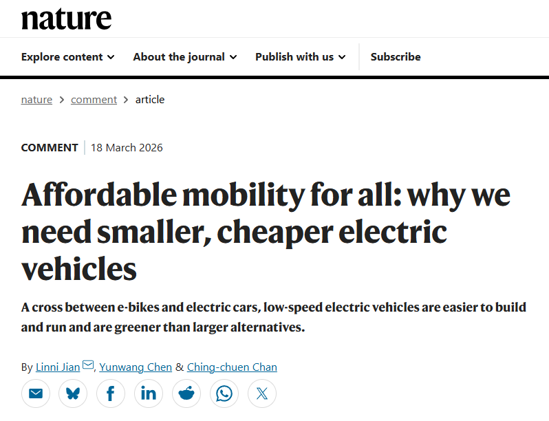 3月18日,香港城市大学(东莞)能源与动力专业教授、发展规划处主任蹇林旎以第一作者兼通讯作者身份在国际顶级期刊《自然》(Nature)上发表题为《小而美的出行革命:低速电动车如何让绿色出行惠及每一个人》(Affordable mobility for all: why we need smaller, cheaper electric vehicles)的评论文章,呼吁人们关注一种介于电动自行车与汽车之间的交通工具——低速小型电动车。它正为全球范围内被主流电动车革命排除在外的低收入弱势群体提供一条更加包容的、可负担的绿色脱碳之路。