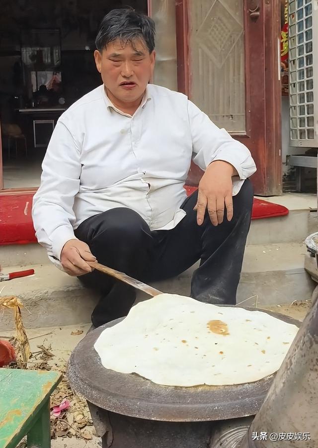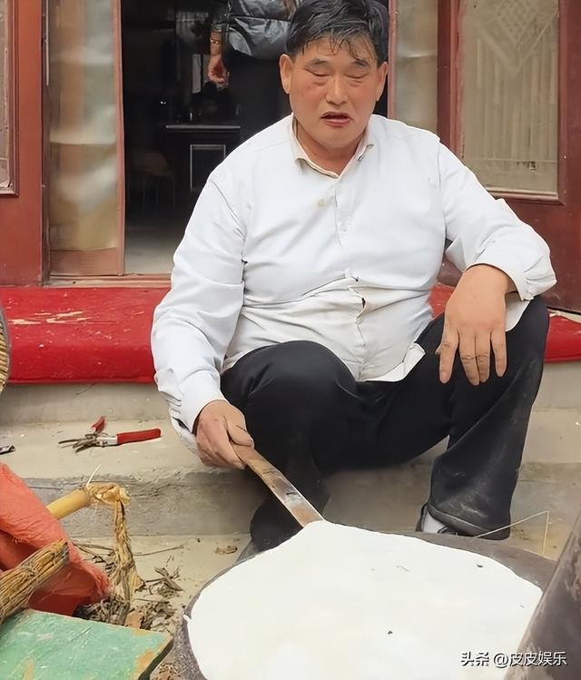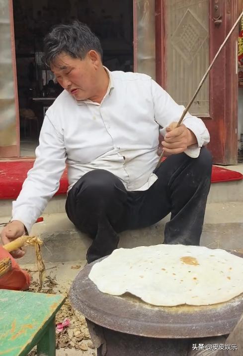 他上身穿着白衬衫,下面一条黑西裤,看着像是刚从商演回来,穿的还挺正式的,结果是在家门口烤大饼,