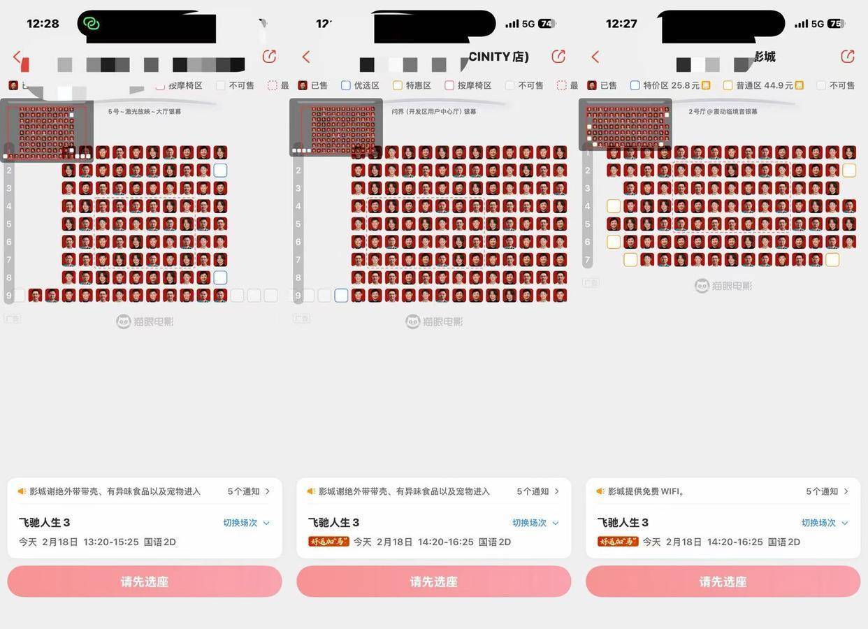 “《飞驰人生3》确实是片单里比较有优势的一部,无论是题材还是演员号召力都有,应该是不少人第一部会选择的电影”,一位资深影院经理告诉蓝鲸新闻记者。事实上,春节档战况果然如此。以蓝鲸新闻记者所在的某三线城市影院为例,《飞驰人生3》的热门场次几乎全城满座,其他时段场次也仅有部分视线不佳的零散座位空余。